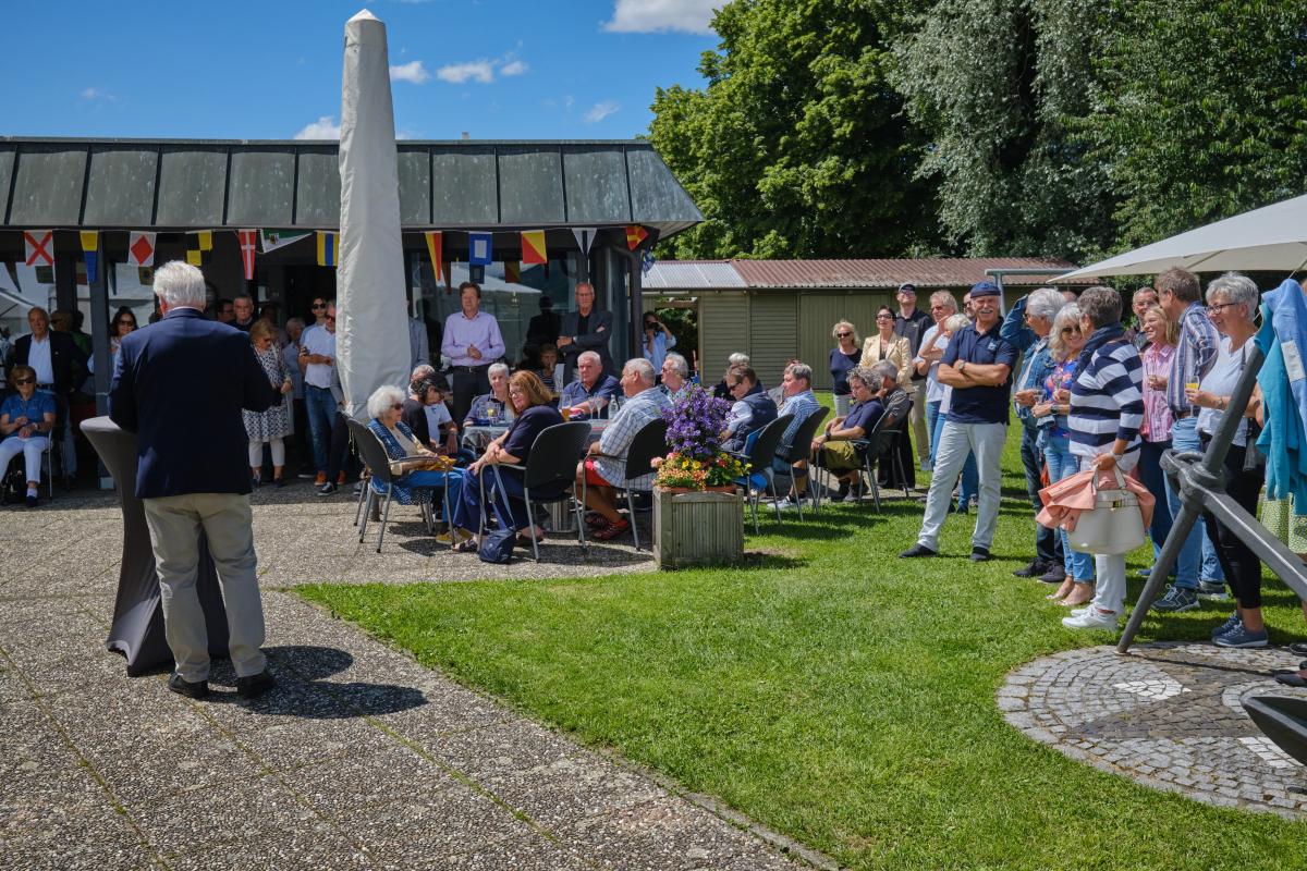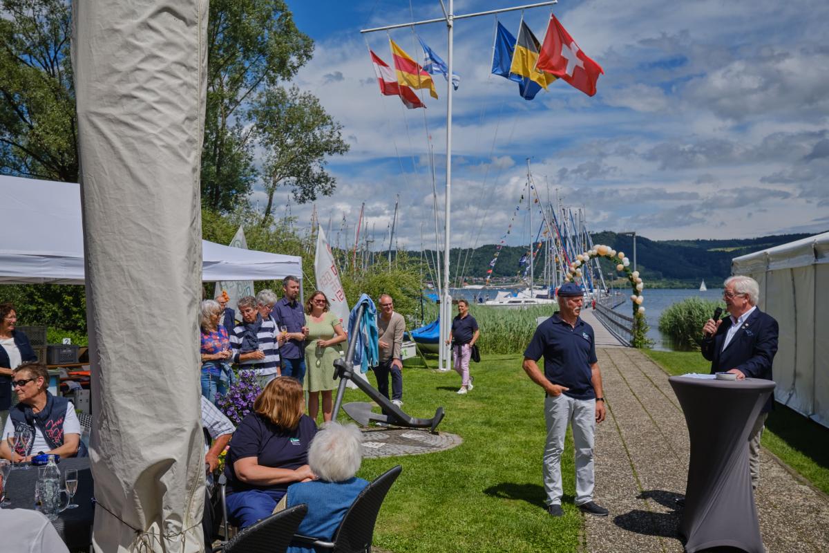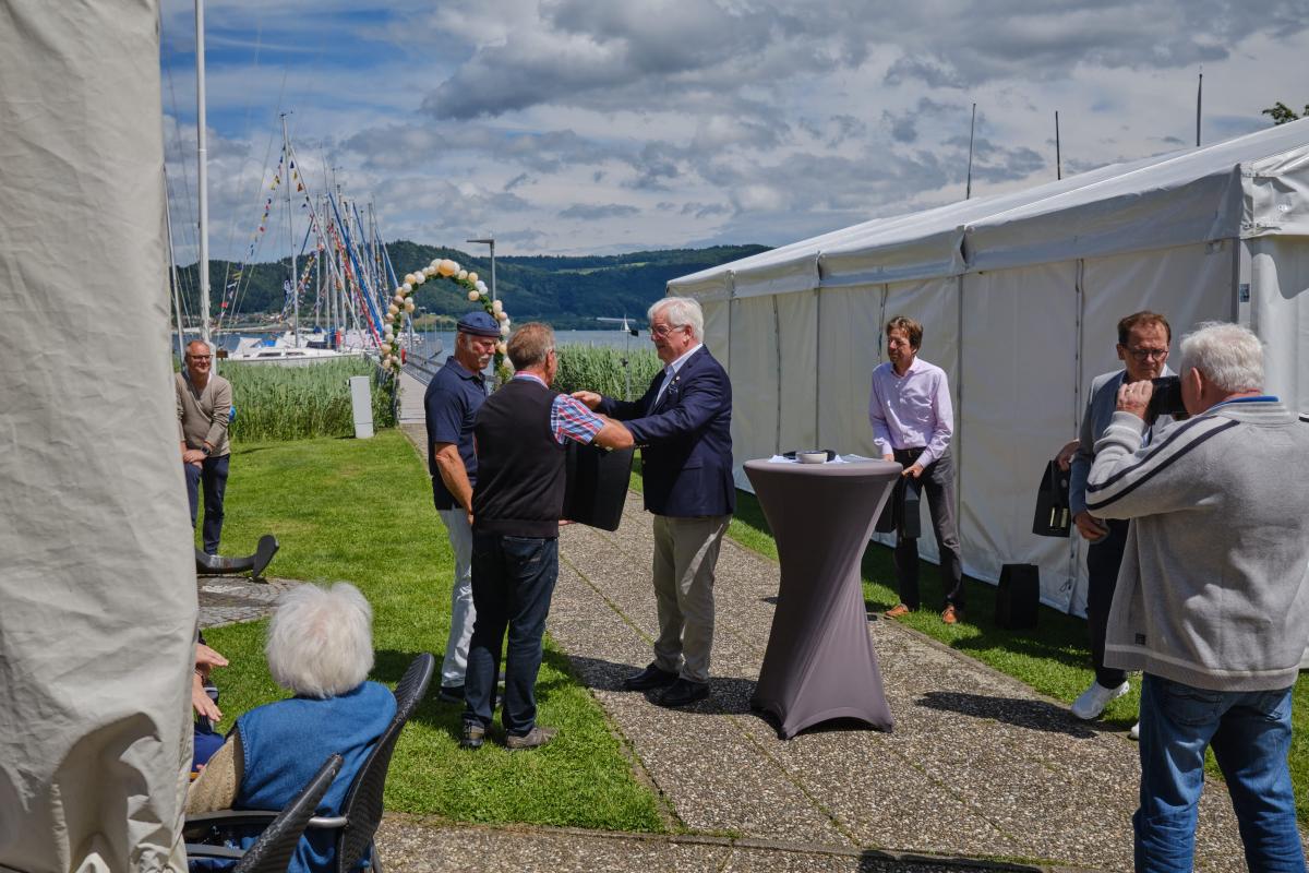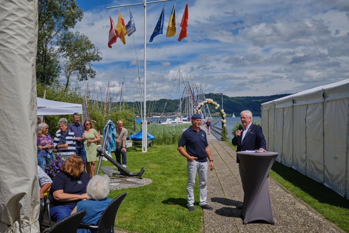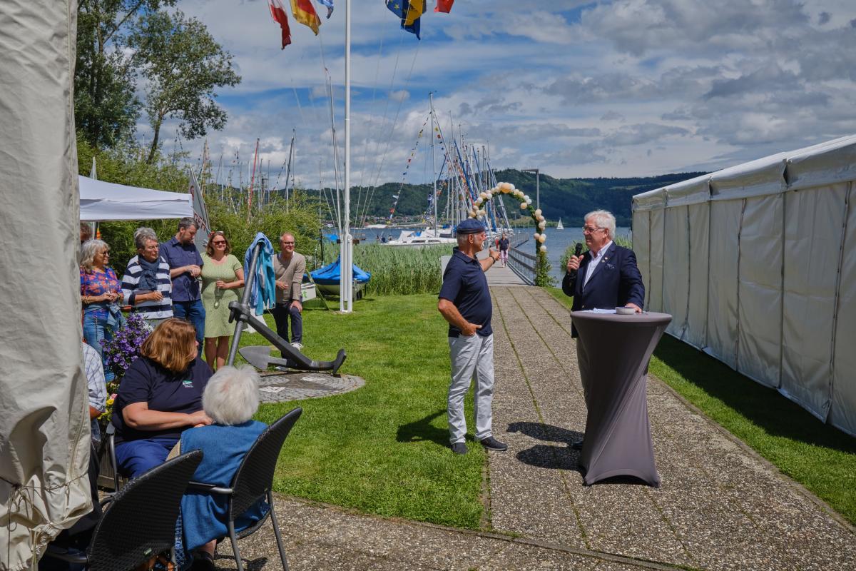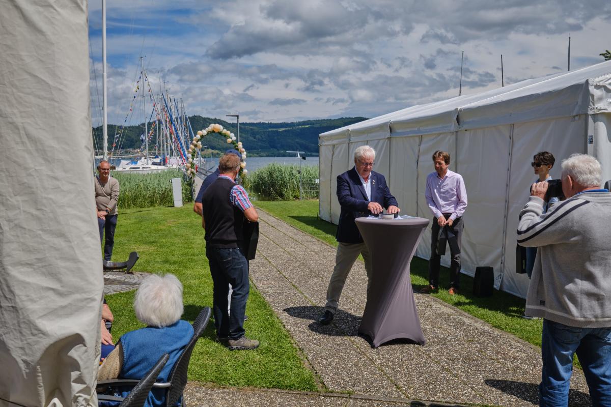 Am vergangenen Wochenende versammelten sich die Mitglieder des Segelclubs Bodman zur feierlichen Einweihung ihres in Eigenregie sanierten Stegs. Kuno Storz, der Vorsitzende des SCBo, eröffnete die Veranstaltung mit einer herzlichen Begrüßung der Gäste. Besonders erfreut zeigte er sich über die Anwesenheit der Präsidentin des Segelverbandes Baden-Württemberg, Frau Kromer Schall, die er herzlich willkommen hieß.