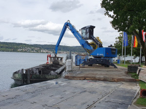 Die Schute pendelt täglich etwa sieben bis acht Mal zwischen unserem Hafenbecken und dem Umschlagplatz im Gemeindehafen Bodman. Dort werden die ausgebaggerten Sedimente auf Lkw´s verladen und fachgerecht abtransportiert.